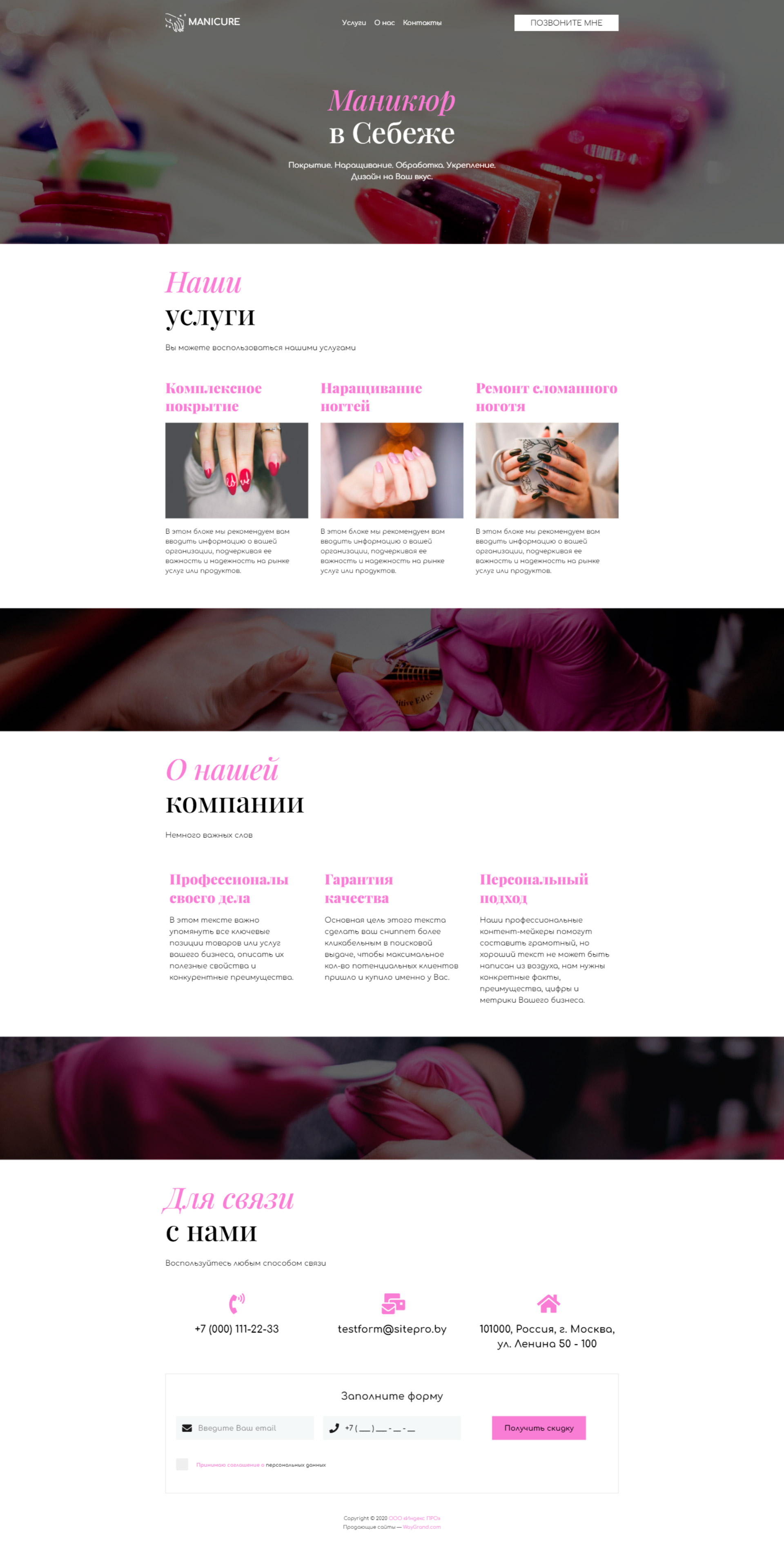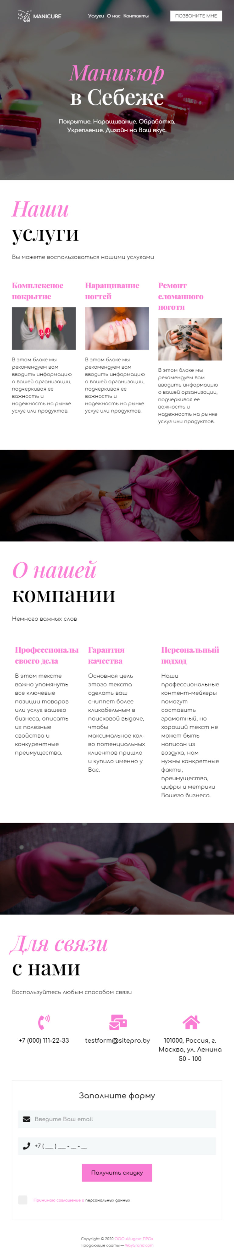 Закажите готовый продающий сайт визитка #1107102 в Астрахани за 5-7 дня «под ключ»: свёрстан, отрисован и готов к рекламе. Тематика шаблона «Маникюр в Себеже».