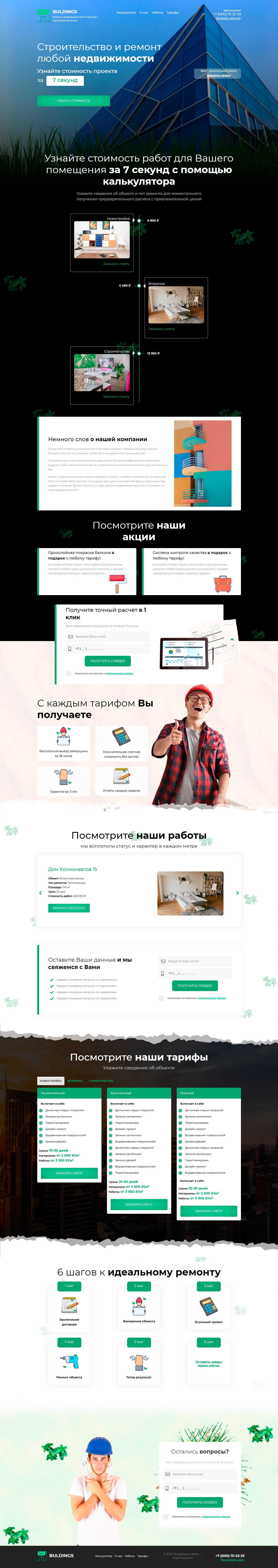 - Промоблок "Строительство и ремонт любой недвижимости" с кнопкой призыва к действию "Узнать стоимость"