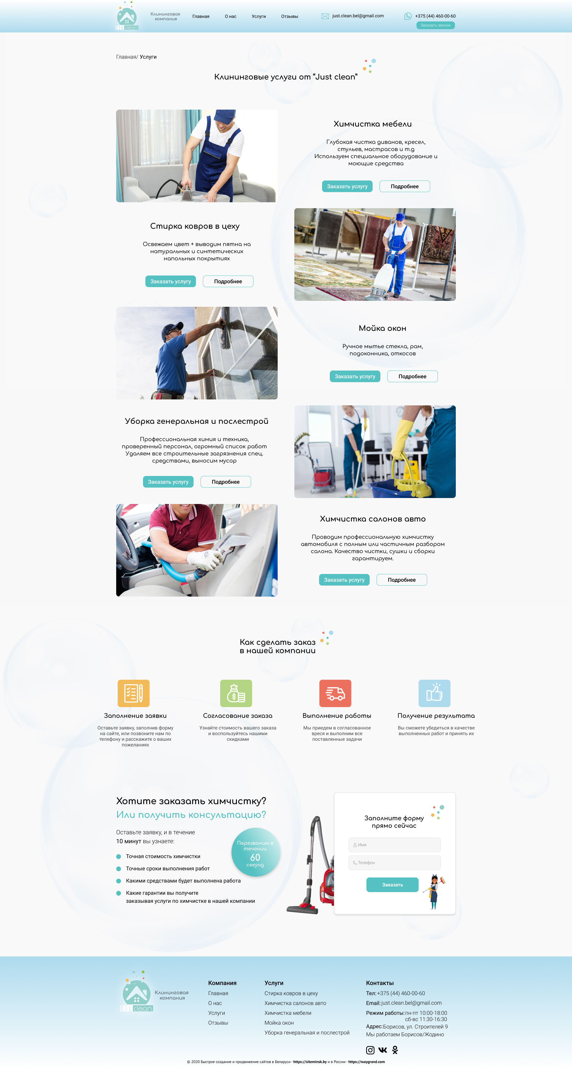 - Промоблок "Профессионально очистим любые поверхности" с кнопкой призыва к действию "Каталог"