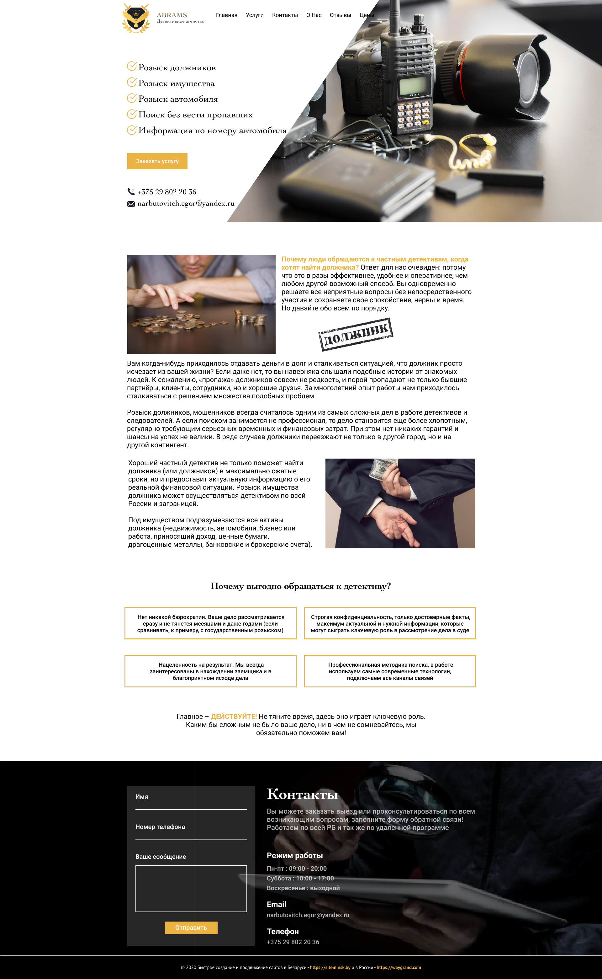 - Промоблок "Частное детективное агентство" с кнопкой призыва к действию "Заказать услугу"