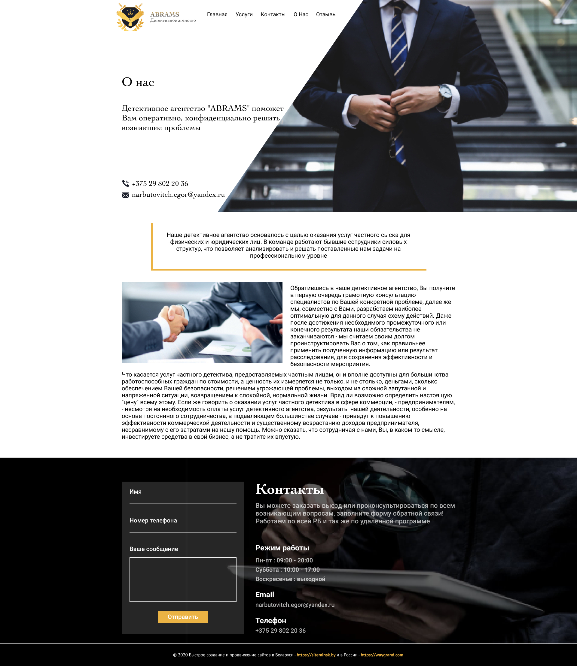 Закажите готовый продающий сайт визитка #239 в Астрахани за 5-7 дня «под ключ»: свёрстан, отрисован и готов к рекламе. Тематика шаблона «Частное детективное агентство».